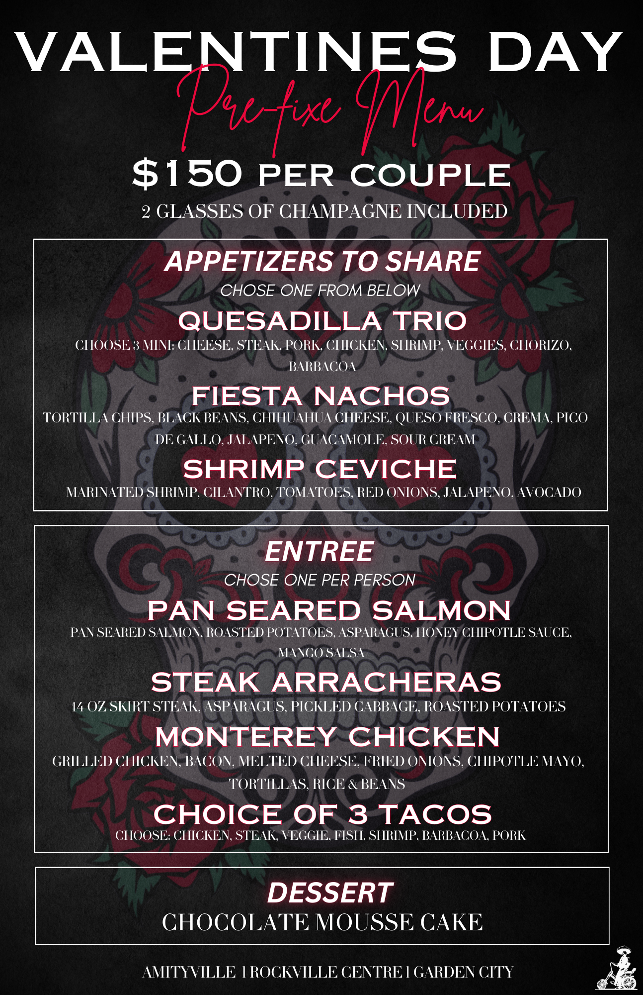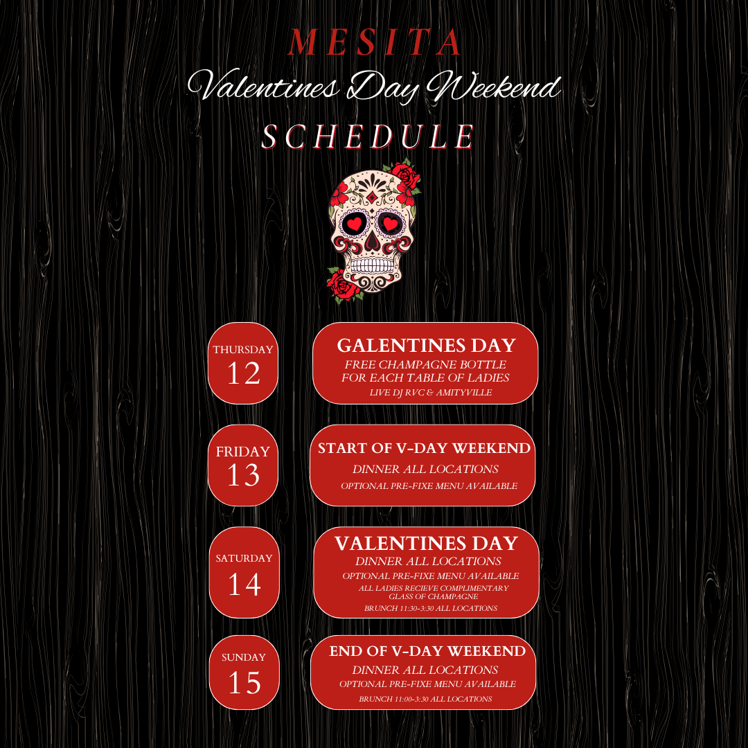 Celebrate Valentine’s Day Weekend at Mesita from Thursday, February 12 through Sunday, February 15. Join us for Galentine’s Day on Thursday with a complimentary champagne bottle for every table of ladies and live DJs at our RVC and Amityville locations. The weekend continues with Valentine’s Day dinner at all locations, featuring an optional pre-fixe menu, plus a complimentary glass of champagne for ladies on Valentine’s Day. Brunch will be served Saturday and Sunday from 11:00–3:30, and make Mesita your destination for love, friendship, and great food all weekend long. đź’–